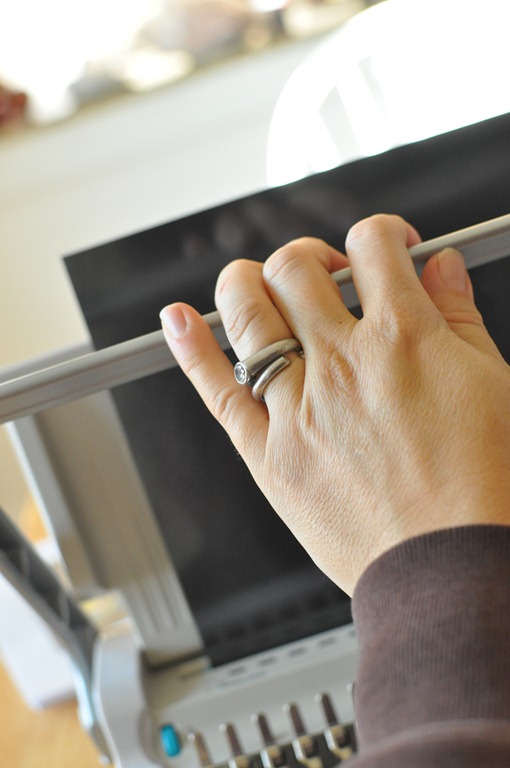 When you notice the freshly cut pages aren’t wanting to stay in their designated comb line, slowly move the smaller lever away from your body (as indicated by the blurry picture of my hand) towards the larger hole punching lever.