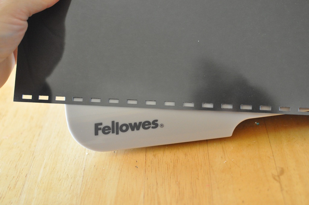 10. As you hole punch, the completed pages will be inserted through the quickly satiated plastic binding combs, identical to the way we inserted the clear front cover. We call this continuous feeding, kind of like on-demand nursing.