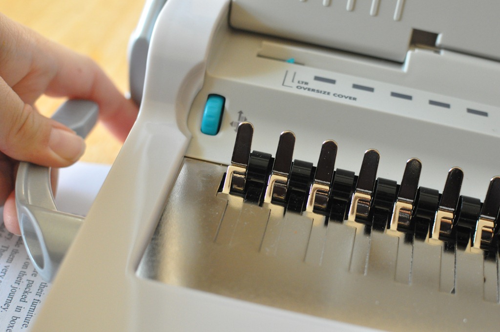 8. Now it is time to comb punch your printed eBook! Line (up to) 10 pages flush with the turquoise tab on the left-hand side of your machine. Once again, make sure all of the pages are even and inserted fully into the horizontal opening of the machine. Trust me, it is maddening when you spend time binding a book and some of the openings are at the edge of the paper and the comb continually slips through the broken paper hole. (Note: there “should” be a black comb below those pages.)