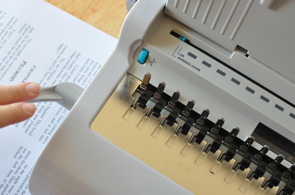 9. Pull larger lever down to hole punch your eBook (that is no longer has an “e”).
