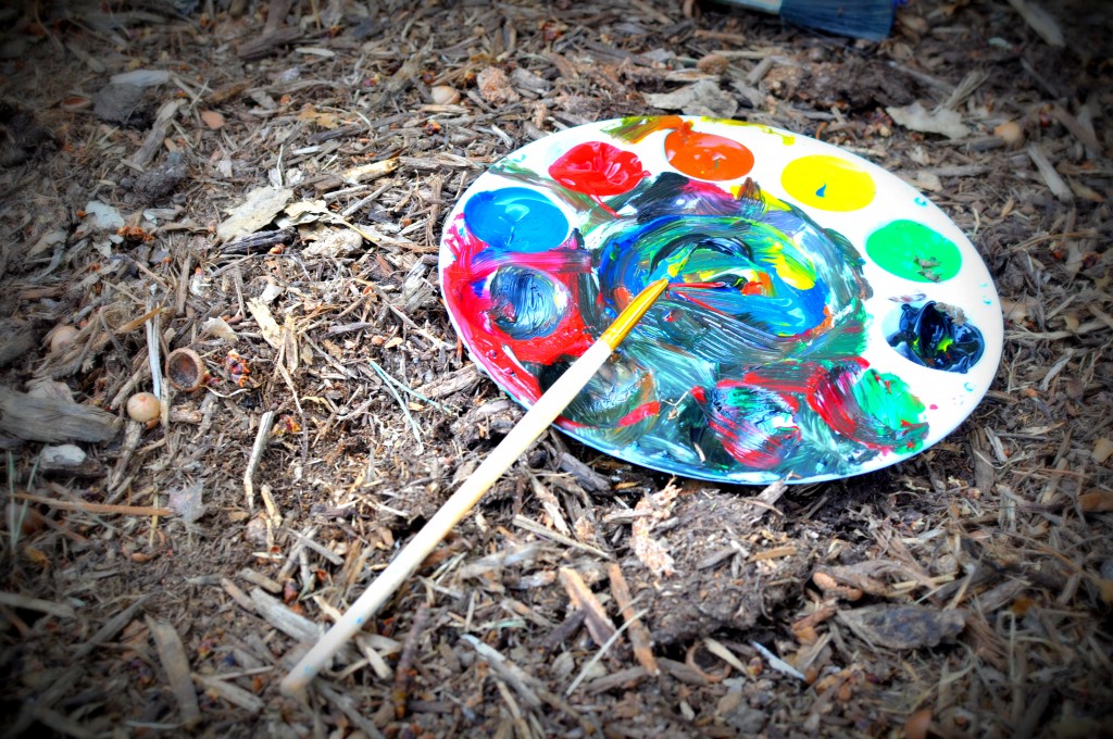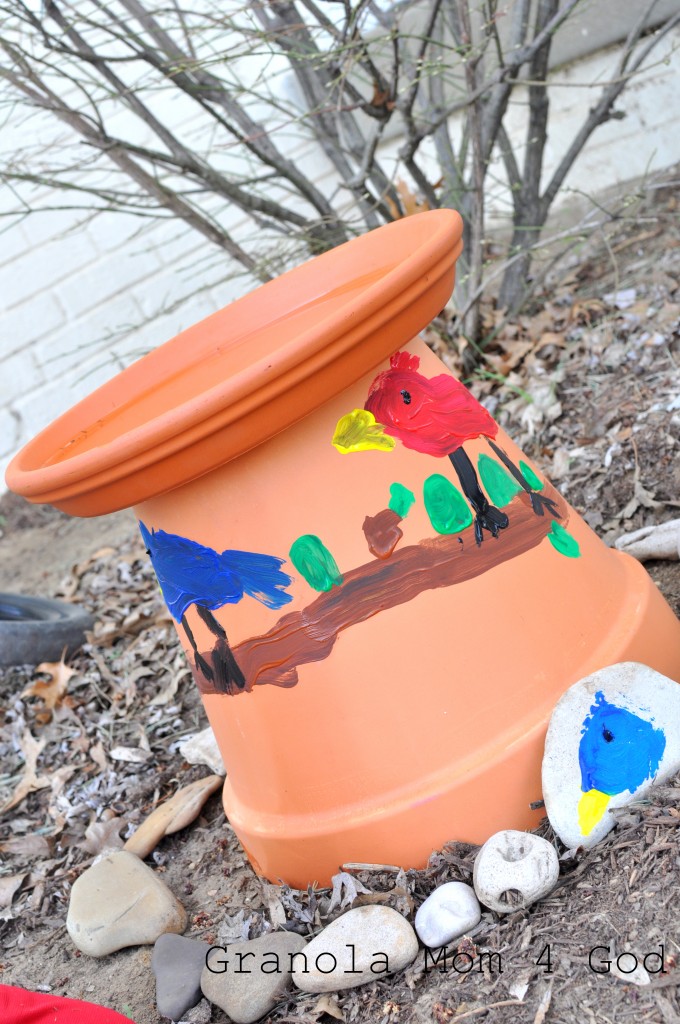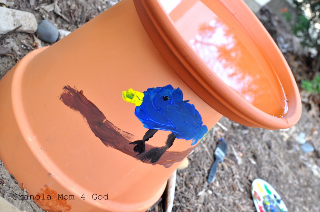 Taking a rather large clay pot, we inverted the base and placed the drip saucer on top. Asher decided to decorate our birds’ shower.